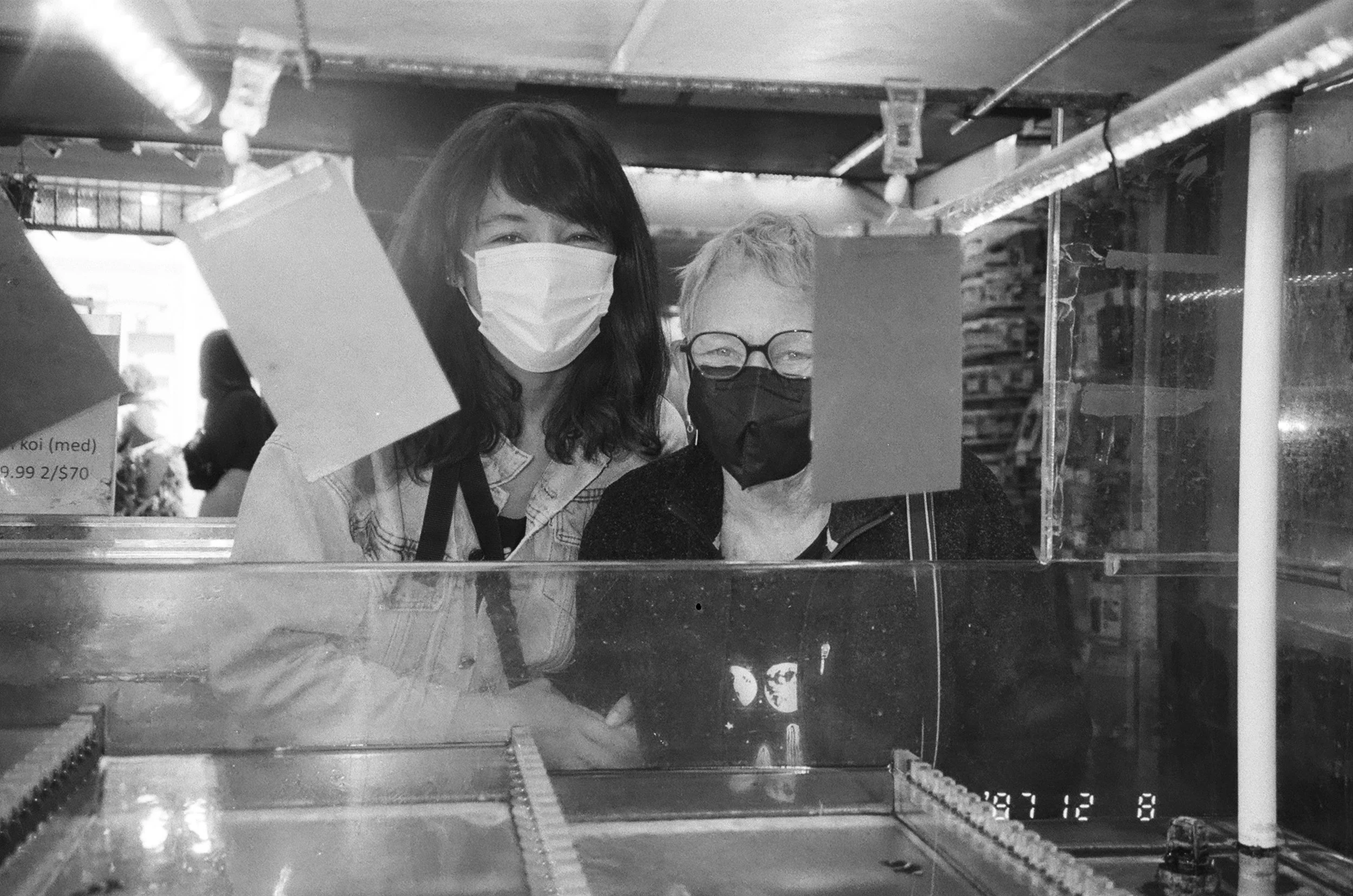 A young woman with exaggerated makeup and large hair, posing with an elderly woman with glasses and a scarf, in a black and white photo.