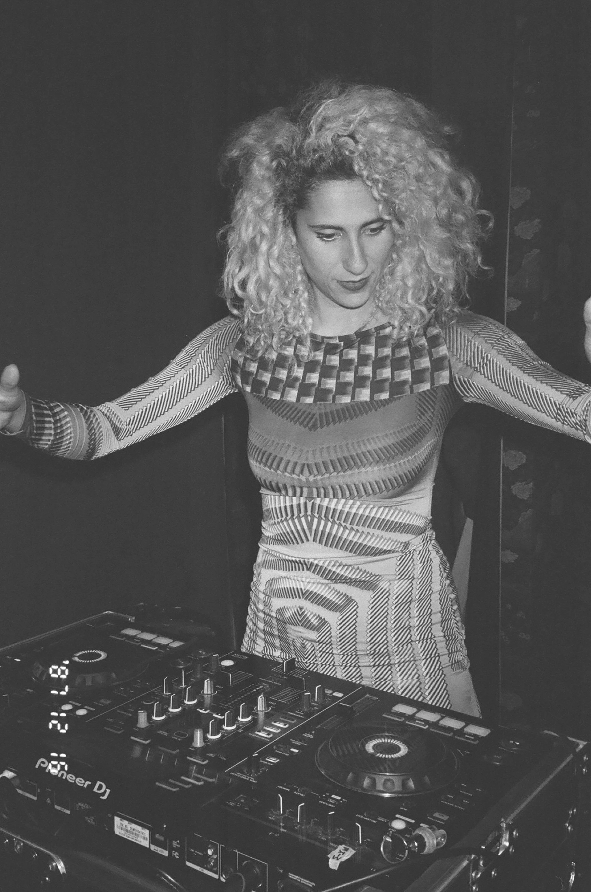 A woman singing into a microphone on stage, with a person behind her operating DJ equipment, in a dimly lit venue.