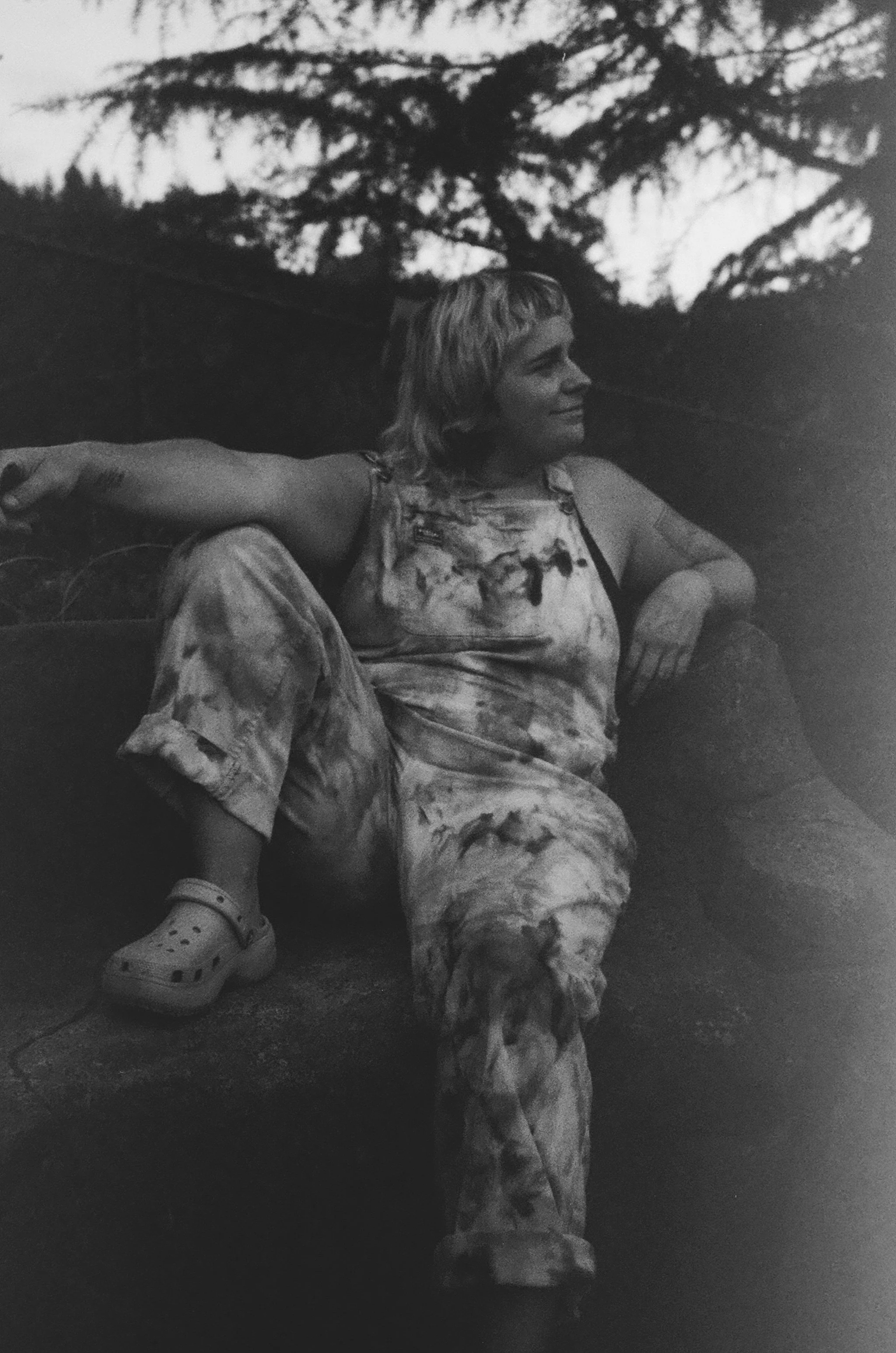 Young woman with shoulder-length hair and earrings crouching on a bag, in front of a corrugated metal wall, in a black-and-white photo.