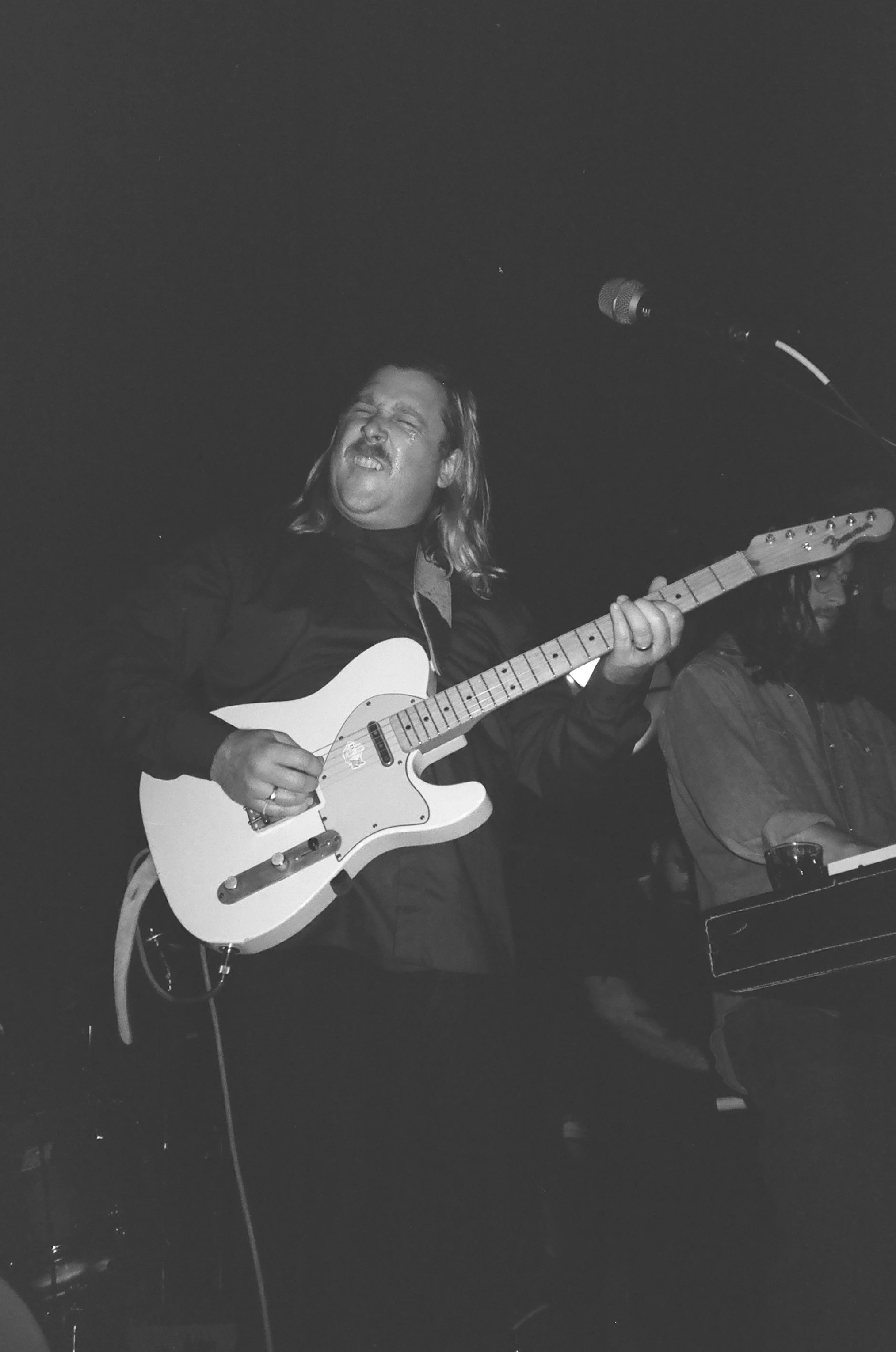 A musician wearing sunglasses and a hat, playing an electric guitar on stage with stage lights shining behind him.