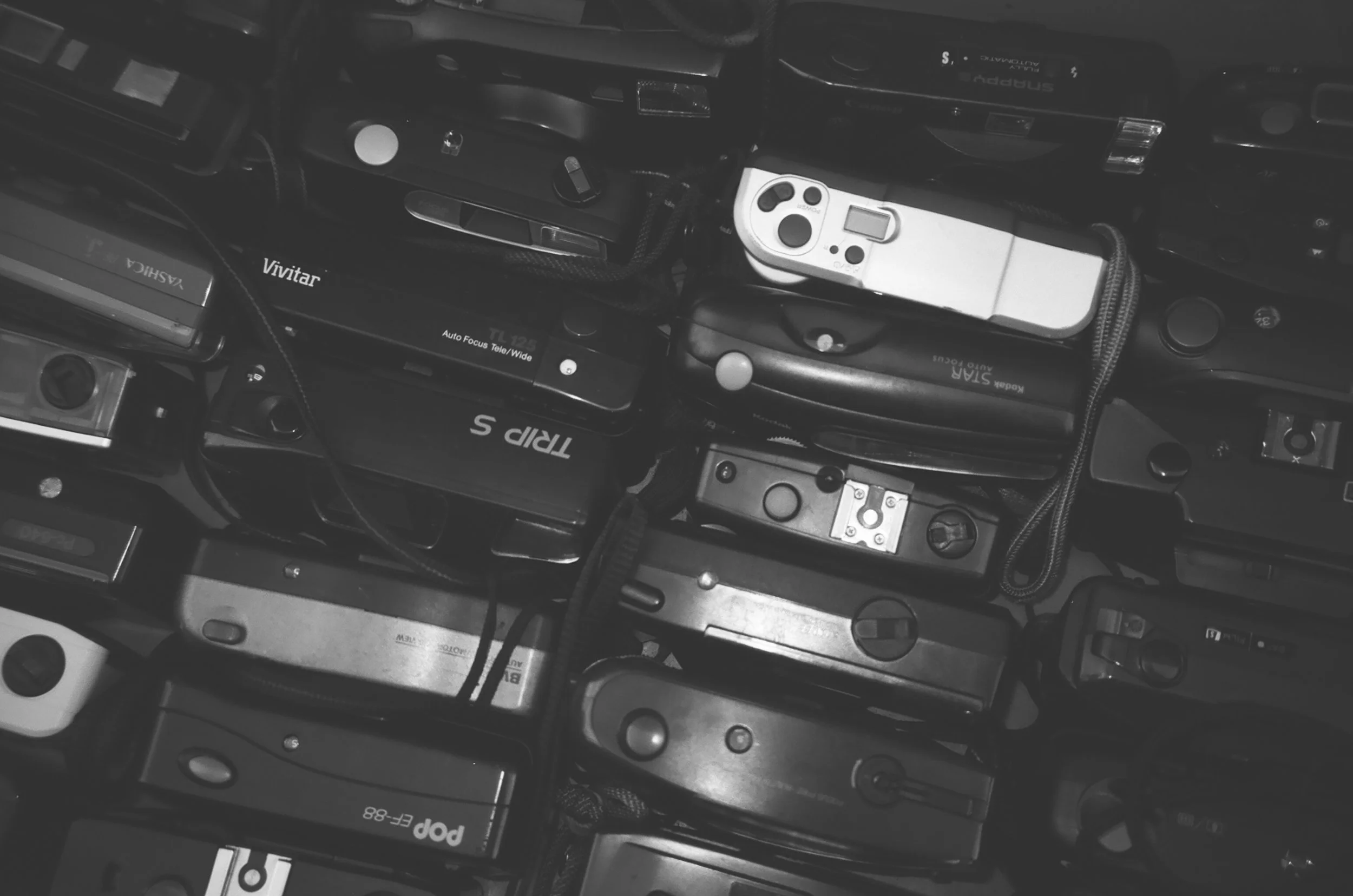 A collection of vintage camera equipment arranged closely together, including different camera bodies, lenses, and accessories.