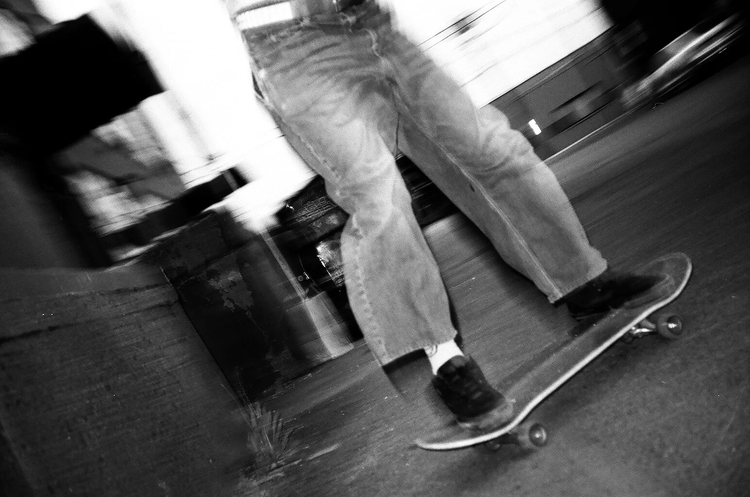A person in jeans and sneakers riding a skateboard indoors, with blurred background.