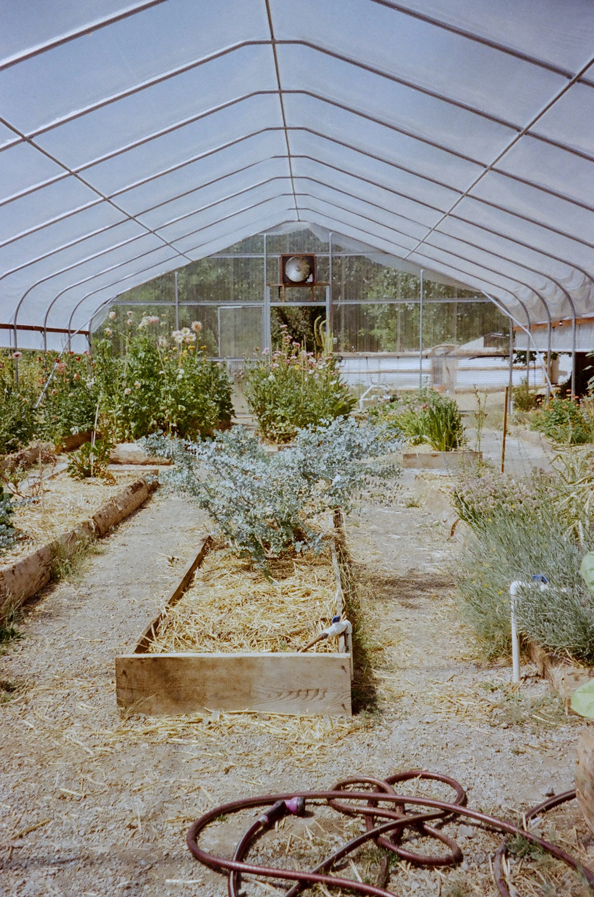 Inside a greenhouse with various plants and flowers growing in wooden and raised beds, with a fan and an old-fashioned clock on the back wall, and a garden hose on the ground.