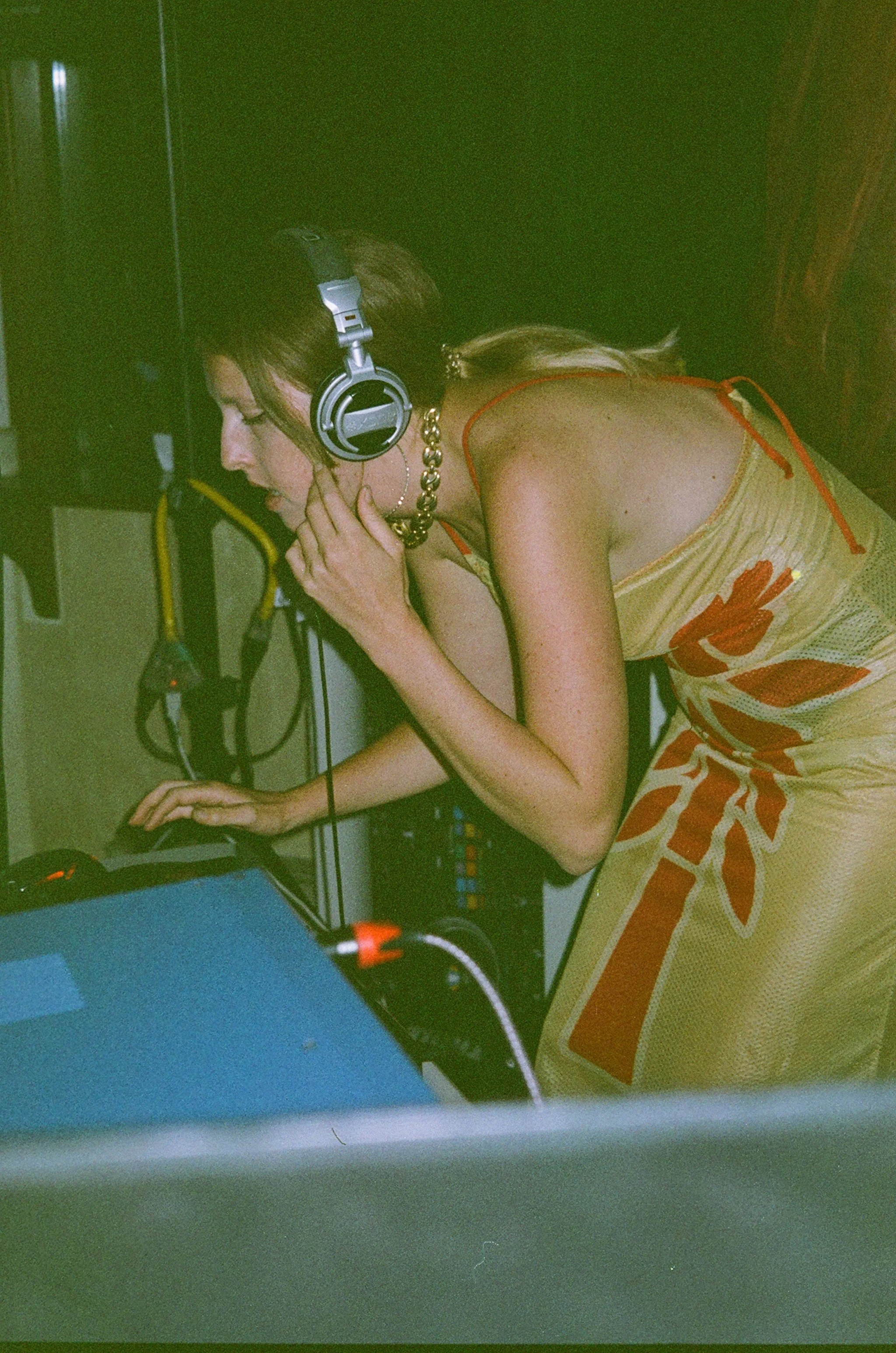A woman DJ wearing headphones, a sleeveless yellow dress with orange floral patterns, and a gold necklace, using DJ equipment in a dimly lit environment.